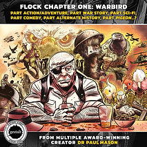 FLOCK #1: Warbird is part 1 of a 4 issue comic book mini-series by Ledger award-winning cartoonist Dr. Paul Mason (The Phantom, Kid Phantom, The Eldritch Kid: Bone War), and edited by Amanda Bacchi (The Phantom, The SuperAustralians). Special Guest variant cover artist across the series will be James Brouwer (The Deep animated series, and graphic novel, Lustration #1, Justice League Beyond #10), with lettering and book design by Wolfgang Bylsma (Gestalt comics EIC, Neverlanders).
